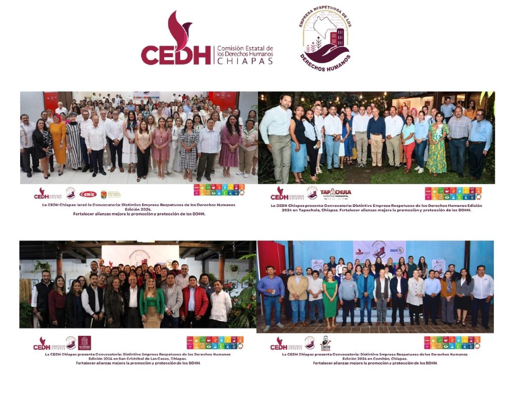 Llevamos a cabo el lanzamiento de la convocatoria del Distintivo Empresa Respetuosa de losDerechos Humanos Edición 2024, en las instalaciones de CMIC Delegación Chipas en laciudad de Tuxtla Gutiérrez; además, estuvimos presentes en los municipios de Tapachula, San Cristóbal de Las Casas y Comitán de Domínguez, donde compartimos con empresas yemprendimientos de diferentes rubros, los objetivos, ventajas y proceso del Distintivo.